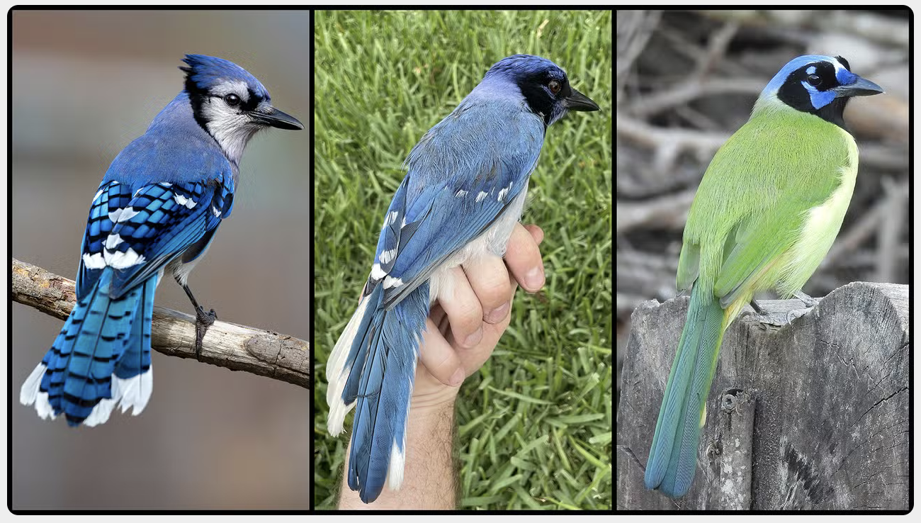 En effet les parents sont tous les deux des geais, mais ils peuplent des régions très distantes : le geai vert (Cyanocorax yncas) est un oiseau tropical d’Amérique centrale tandis que le geai bleu (Cyanocitta cristata) vit plus au nord, entre le Canada et Texas. Ils ne se sont pas reproduits ensemble depuis plus de 7 millions d’années, date à laquelle vivait leur ancêtre commun le plus récent.